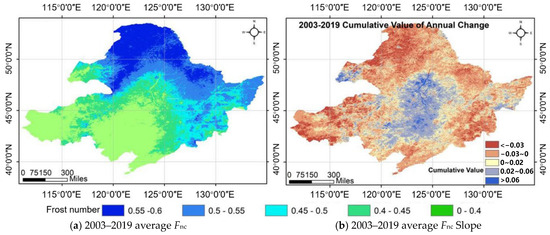 Further refinement of the distribution status of permafrost regions in Northeast China (Figure 5a,b) reveals that as latitude increases, permafrost undergoes a transition from sporadic distribution to island-like and continuous permafrost distribution. The south boundary of the Northeast China permafrost is W shaped, extending southward to the Aershan Mountains and eastward to Yichun. The continuous permafrost in Northeast China is mainly distributed in the northwest of the Da Xing’an Mountains. From 2003 to 2019, the ground surface frost number in the Da and Xiao Xing’an Mountains regions showed a downward trend, among which the average ground frost number in the north of the southern boundary of the Northeast China permafrost decreased by 0.014, the average ground frost number in the Da Xing’an Mountain decreased by 0.020, and the average frost number in the Da Xing’an Mountain was greater than that in the Xiao Xing’an Mountain. Using the ground surface frost number Fnc under the influence of ground surface vegetation factors as the standard to classify the stability types of permafrost in Northeast China, permafrost in Northeast China can be divided into extremely stable permafrost, with Fnc ≥ 0.66; stable permafrost, 0.55 ≤ Fnc < 0.66; sub-stable permafrost, 0.51 < Fnc < 0.55; transitional and unstable permafrost, 0.49 ≤ Fnc ≤ 0.51; and seasonal frozen soil (maximum frozen depth > 1.8 m), 0.40 ≤ Fnc < 0.49 (Figure 5c,d).