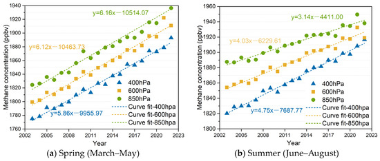 Methane concentration in the near-surface troposphere in Northeast China shows an upward trend in each season (Figure 7), which is consistent with the overall trend of methane concentration in the troposphere in Northeast China. However, the growth rate varies with seasonal changes, with the highest growth rates of methane concentration in the near-surface troposphere in spring being 5.86 ppbv/a (400 hPa), 6.12 ppbv/a (600 hPa), and 6.16 ppbv/a (850 hPa). The growth rates of methane concentration in the near-surface troposphere in autumn and winter take second place, with linear trend growth rates of 6.14 ppbv/a (400 hPa), 5.83 ppbv/a (600 hPa), and 5.34 ppbv/a (850 hPa) in autumn and 5.73 ppbv/a (400 hPa), 5.47 ppbv/a (600 hPa), and 4.89 ppbv/a (850 hPa) in winter. The growth rate of methane concentration in the near-surface troposphere in summer is the lowest, with linear trend growth rates of 4.75 ppbv/a (400 hPa), 4.03 ppbv/a (600 hPa), and 3.14 ppbv/a (850 hPa). It can be seen that in recent years, the main methane release activities in the near-surface troposphere of Northeast China have been concentrated in the spring.