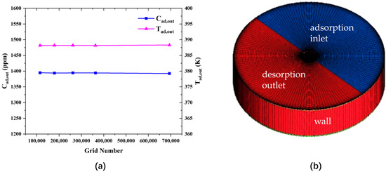 The ideal gas law was used to calculate the density of the mixed gas. To calculate the thermal conductivity and dynamic viscosity of the mixed gas, the mass-weighted mixing law was applied. The ANSYS Fluent solver incorporated the mass conservation equation of the adsorbent through User-Defined Scalars. The pressure-velocity coupling field was solved using the SIMPLE algorithm. The gradient term and convection term were discretized using the least squares cell-based scheme and the second-order upwind scheme, respectively. A grid independence test was conducted, and based on accuracy and computational cost considerations, a grid size of 262,000 was chosen for the calculations. Figure 1a illustrates the variations in average CO2 concentration and temperature at the adsorption outlet. Figure 1b displays the mesh used in the computational analysis conducted in this study.