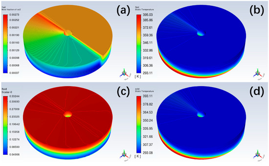 Distributions of molar concentration of CO2 (a); fluid temperature (b); adsorption amount of CO2 (c); and adsorbent temperature (d). (13X ω = 0.5 r/min, Tad,in = 293.15 K, Tde,in = 393.15 K, Vad,in = 1 m/s, Vde,in = 1 m/s).