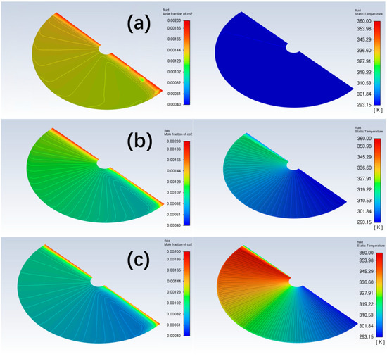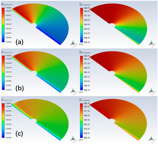 (1) In the rotation speed range of 0.5–3 rpm, adjusting the speed mainly affects circumferential concentration and temperature distribution but has little impact on axial concentration and temperature;
