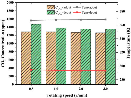 Effect of the rotating speed on the concentration of CO2 and temperature at the outlet (13X Tad,in = 293.15 K, Tde,in = 393.15 K, Vad,in = 1 m/s, Vde,in = 1 m/s).