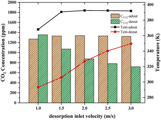 Variation of the outlet averaged concentration of CO2 and temperature at the outlet with different desorption inlet velocities. (13X ω = 2 r/min, Tad,in = 293.15 K, Tde,in = 393.15 K, Vad,in = 1 m/s).
