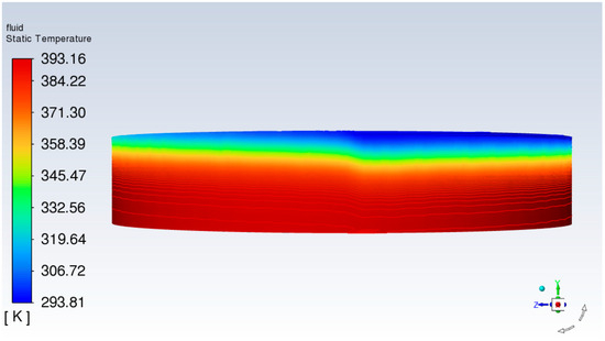 Figure 5 and Figure 6 depict the average concentration and temperature at the outlets under different desorption inlet flow rates. As the desorption inlet velocity increased, the average temperature at the desorption outlet also increased. This is because as the flow rate increases, the heat transfer area per unit mass flow rate decreases, resulting in reduced heat transfer performance of the rotary wheel and the desorption outlet temperature getting closer to the desorption inlet temperature. As to the adsorption outlet temperatures, except for the case of 1 m/s, they were around 391 K (close to the desorption inlet gas temperature) regardless of the desorption inlet velocity. Since the adsorption inlet velocity is 1 m/s, with a desorption inlet velocity higher than 1 m/s, the overall heat accumulating in the rotary wheel would increase. Therefore, the high temperature region below in Figure 7 will be much larger than the low temperature region above. Additionally, due to the rotation, the temperature distribution on the same side will be more uniform, i.e., the temperature distribution shows axial layering. The adsorption outlet sector will also be affected by the desorption inlet sector on the same plane, making the adsorption outlet temperature close to the desorption inlet temperature.