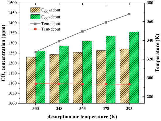 Effect of the desorption inlet air temperature on the adsorption amount and temperature at the adsorption outlet (13X ω = 2 r/min, Tad,in = 293.15 K, Vad,in = 1 m/s, Vde,in = 1 m/s).
