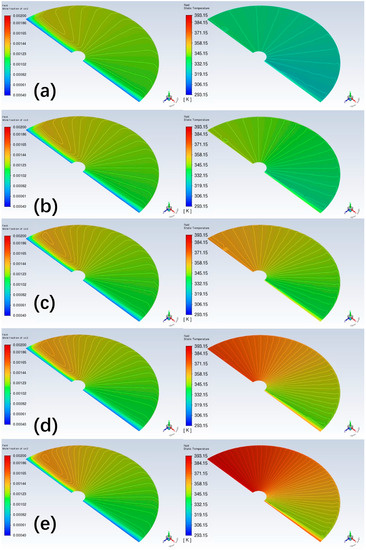 Contour of the mole fraction of CO2 (left) and temperature (right) on the adsorption outlet at different desorption air temperatures: (a) 333 K; (b) 348 K; (c) 363 K; (d) 378 K; and (e) 393 K. (13X ω = 2 r/min, Tad,in = 293.15 K, Vad,in = 1 m/s, Vde,in = 1 m/s).