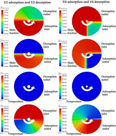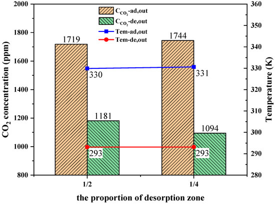 Variation of the outlet average concentration of CO2 and temperature at the outlet with different proportions of the desorption zone. (13X ω = 2 r/min, Tad,in = 293.15 K, Tde,in = 393.15 K; Vad,in = 3 m/s; and Vde,in = 1.5 m/s when the proportion of desorption zone is 1/2, or Vad,in = 2 m/s and Vde,in = 3 m/s when the proportion of desorption zone is 1/4).