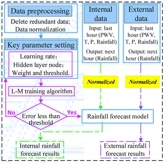 General flowchart of establishing short-term rainfall forecast model based on the BP-NN algorithm using GNSS observations.