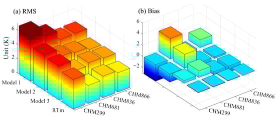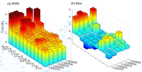 Nine representative Tm models are selected to further validate the accuracy of the proposed RTm model: GTm-I [28], GTm-H [29], GTrop [38], GPT2w [32], IGPT2w [39], GPT3 [33], CTm [40], NNTm [41], and Bevis [25]. Figure 5 shows the comparison results of different models in calculating Tm and the Tm derived from the data from the five radiosonde stations from 2020 to 2021. As can be seen, the RTm model has the highest accuracy and good stability in the study area. Table 3 presents the specific statistical results of the 10 models, which reveal, while that the RMS of the CTm and RTm models are both below 3 K, the RTm model is still superior to the CTm model.