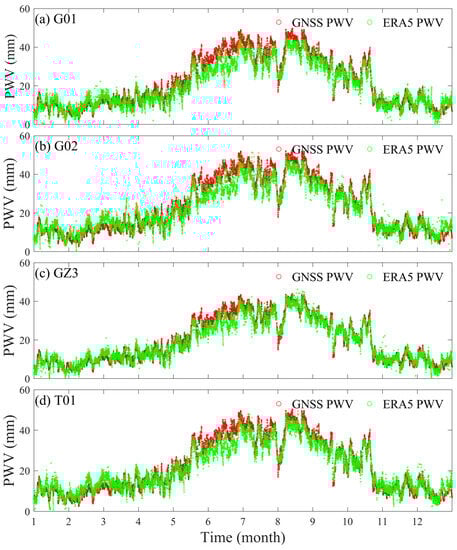 Compared to GNSS-derived PWV, ERA5-provided PWV is an underestimate when PWV levels are high (Figure 6). This is because the ERA5-provided PWV is a numerical assimilation result and cannot accurately capture small-scale extreme weather changes. In addition, it can be found that the PWV difference is largest from June to August for those stations, this is because June to August corresponds to the Summer, and levels of atmospheric water are larger in Summer than in other seasons. Therefore, the difference in PWV between GNSS and ERA5 is slightly larger during this period.