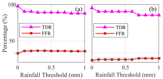 The simulated output of the rainfall forecast model can be negative and fluctuate around 0 mm. Hence, an accurate threshold is required to determine the simulated rainfall threshold. The rainfall threshold in this study is determined based on the highest TDR and lowest FFR of the rainfall forecast model using the BP-NN algorithm. The method for determining the rainfall threshold is to set an initial variable N, and set simulated rainfall values less than or equal to N mm to 0 mm, and simulated rainfall values greater than N mm to 1 mm. Thus, the range of the variable N is 0–1 mm. Figure 7 shows the results of the simulated and forecast TDR and FFR for the spring rainfall in 2021 under different rainfall threshold settings for scheme 1, where Figure 7a,b show the simulated rainfall forecast results and external rainfall forecast results, respectively. It can be seen that as the rainfall threshold N increases, the TDR decreases and the FFR increases. In addition, the trend in the forecast experiment is similar to that in the simulated experiment. The TDR and FFR also decrease as the threshold increases. Therefore, the rainfall threshold for the simulated and forecast rainfall events is 0 mm according to the selection principle of the rainfall threshold with the highest TDR and lowest FFR. Furthermore, the corresponding accuracies of the proposed rainfall forecasting model are the highest, at 97.53%/2.48% and 96.30%/42.22%, respectively.