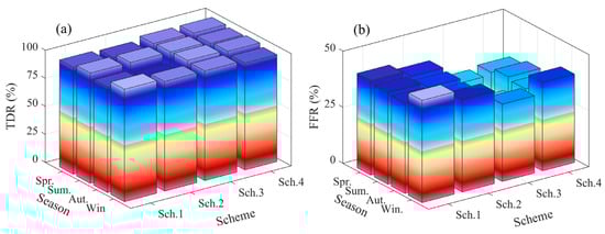 TDR and FFR for rainfall forecasting under different seasons for the four schemes, where (a) and (b) are the TDR and FFR of proposed rainfall forecasting model, respectively.