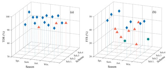 TDR and FFR accuracy of rainfall forecasting for the four schemes in the forecasting experiments on a seasonal scale ((a): 80–90%: orange triangle; 90–100%: blue diamond; (b): 20–30%: green circle; 30–40%: orange triangle; 40–50%: blue diamond).