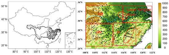 The spatial distribution of 367 rain gauge stations (black dots) in the middle and lower Yangtze River regions used in this paper. Mainly including four regions: Hunan Province (HN), Hubei Province (HB), Jiangxi Province (JX), and the lower reaches of the Yangtze River. Two important mountains are labeled as follows: Ta-pieh Mountains and Wuyi Mountains (red solid line). Shadings represent surface elevation (Unit: km).