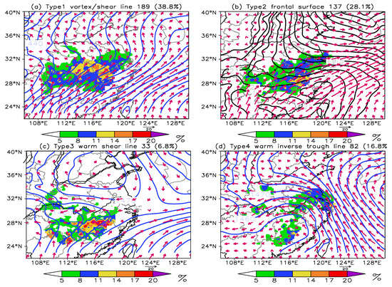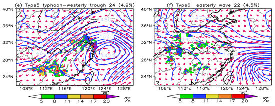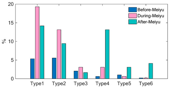In summary, in the MLRYR, Type 1 and Type 2 occur mainly during and after the Meiyu period, with the highest occurrence frequency during the Meiyu period, while Type 3 occurs relatively evenly in the three periods. Type 4 and Type 6 both have absolute large frequency values after the Meiyu season, during which their occurrence frequencies are as high as 78% and 91%, respectively. Type 5 has the highest frequency after the Meiyu season, accounting for 63% of the total frequency.