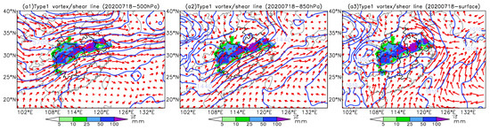 In order to study the weather systems under each pattern and the matching relationship between heavy precipitation areas, typical cases under each weather type were selected for research. Select for analysis. Figure 3a1–a3 shows the weather system configuration diagram at 08:00 on 18 July 2020 (Type 1: Vortex/shear line). At 500 hPa, there is a significant eastward movement of the trough, while at 850 hPa, the southwest vortex trends northeast to southwest. There is a stationary front on the ground near the Yangtze River, and heavy precipitation mainly occurs near the weather system where the westerly jet and stationary front overlap in the front of the low trough and on the right side of the southwest vortex. Figure 3b1–b3 shows the configuration of the weather system on 16 June 2015 at 20:00 (Type 2: Frontal surface). There is a flat westerly airflow at 500 hPa. At 850 hPa, there is a clear temperature line and dense zone near 32° N, namely the front surface. On the ground, there is a significant thermal low system in the south of the front and a cold high-pressure system in the north. The south wind and north wind generated by the thermal low and cold high-pressure systems are opposite each other, and the heavy precipitation mainly occurs near 32° N. Figure 3c1–c3 shows the configuration of the weather system on 1 July 2014 at 08:00 (Type 3: Warm shear line). The western end of the Northwest Pacific subtropical high (WNPSH) extends to 104° E at 500 hPa. There is a strong southwest jet at 850 hPa, which forms a warm shear line with the northerly wind near 32° N. There are also weak, warm shear lines on the ground. The heavy precipitation mainly occurs near the warm shear line and at locations where the southwest jet is strong. Figure 3d1–d3 shows the configuration of the weather system on 19 June 2014 at 08:00 (Type 4: Warm inverse trough line). There is a shallow trough moving eastward above 500 hPa, and WNPSH is located at sea. The southwest jet stream at 850 hPa combines with the southwest wind flow of the low-pressure system, forming a warm inverse trough line at the top of the low-pressure system. The ground is also dominated by easterly airflow. Heavy precipitation mainly occurs near the trough line. Figure 3e1–e3 shows the weather system on 13 July 2013 at 08:00 (Type 5: Typhoon-westerly trough). The upper- and lower-level systems are dominated by the strong login typhoon system. The heavy rainfall in the middle and lower reaches of the Yangtze River mainly occurs near the typhoon. Figure 3f1–f3 shows the weather system on 8 June 2014 at 20:00 (Type 6: Easterly wave). There is a straight westerly airflow above 500 hPa. At 850 hPa, there is a tropical low-pressure system generated in the South China Sea region. The east-west airflow on the south side of WNPSH, combined with the easterly airflow on the north side of the tropical cyclone, moves from west to east. The ground system is not significant. Strong precipitation is mainly localized and dispersed, mainly occurring in areas with terrain barriers.
