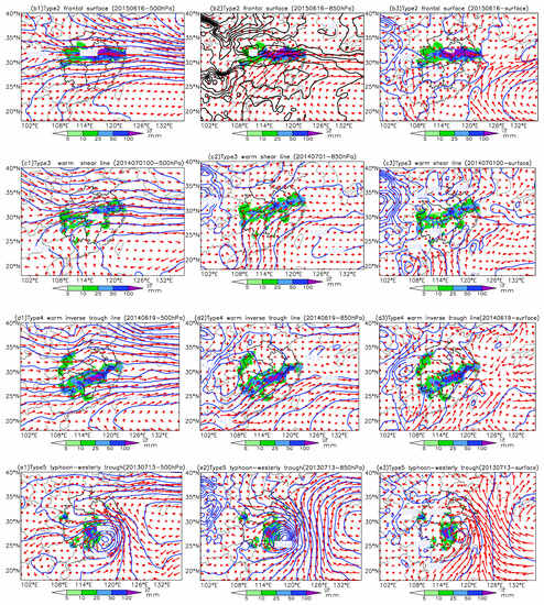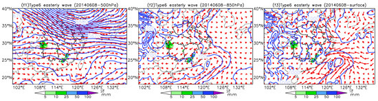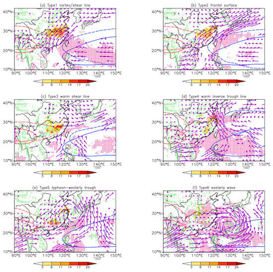 Based on the PCT classification method on 850 hPa height and combined with the average 700 hPa wind, surface pressure, and 850 hPa temperature of all individual cases of six types, rainstorm days in the MLRYR are generated according to the principles of weather science. They combine the synoptic-scale and mesoscale atmospheric conditions affecting heavy precipitation. These circulation types are Type 1: Vortex/shear line (Figure 2a); Type 2: frontal surface (Figure 2b); Type 3: warm shear line (Figure 2c); Type 4: Warm inverse trough line (Figure 2d); Type 5: Typhoon-westerly trough (Figure 2e); and Type 6: Easterly wave (Figure 2f). The definitions of Types 2–4 will be mainly explained. Type 2 frontal surface is the interface of two air masses (cold air and warm air) with different physical properties, such as temperature and humidity. This is mainly based on the analysis of dense zones of sea level pressure and 850 hPa temperature fields. Type 3 warm shear line refers to the shear line composed of southeast and southwest winds or easterly and southerly winds, in which the southwest or southerly wind is dominant. Pushing the shear line from south to north, it is similar in nature to a warm front. Type 4 warm inverse trough line is a trough of low pressure with an opening to the south or southwest in the middle and low latitudes.