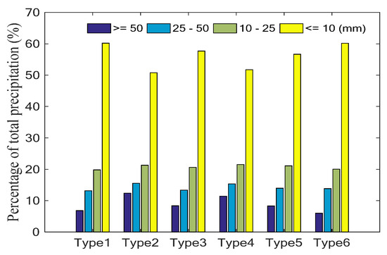The percentage of different magnitude precipitation generated under six weather circulation patterns to their respective total precipitation (unit: %).