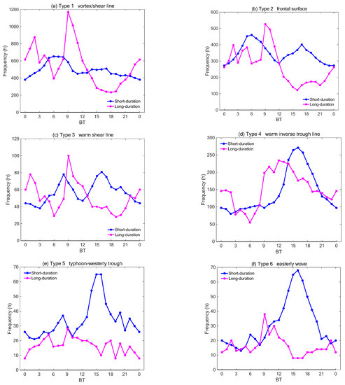 For Type 1, Type 2, and Type 3 (Figure 6a–c), from the perspective of the diurnal variation at the start time, it shows the relatively even double-peak patterns with equivalent frequencies of both peaks for short-duration heavy precipitation (blue line), and the maximum frequency of the start time appears during 06:00–08:00 BT and around 16:00–17:00 BT, while the lower frequencies are at approximately 00:00 BT and 12:00 BT. However, the peak patterns of long-duration heavy precipitation (pink line) show double peaks—A primary and secondary peak. The significant primary peak of the start time of severe precipitation often occurs around 09:00 BT, and the sub-peak time is observed at 01:00–02:00 BT in the night. Seen from the magnitude of frequency, the maximum frequency of long-duration Type 1 appears at 9:00 BT, recorded 1170 times, while the maximum frequency for short-duration heavy precipitation at 06:00 BT reaches 653 times, which is nearly half of the value of 1170 times. This indicates that the heavy precipitation events caused by the low vortex or shear-line system are mostly persistent heavy precipitation events that start at night or in the morning (Figure 6a). The peak frequencies of short-duration and persistent heavy precipitation events of Type 2 and Type 3 are basically identical (Figure 6b,c), indicating that heavy precipitation events occurring under frontal and warm shear synoptic systems can be systematic persistent heavy precipitation events or short-duration convective heavy precipitation events.