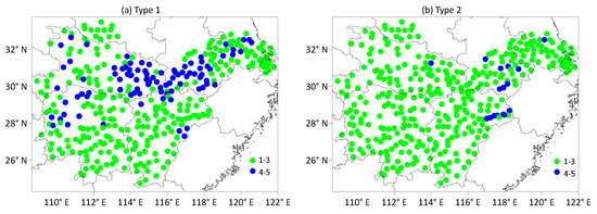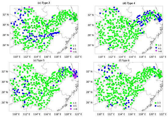 On the whole, the heavy precipitation process is mainly short-duration heavy precipitation (green dots), and the persistent heavy precipitation is the least in MLRYR. The spatial distribution of medium-long and long-duration heavy precipitation is closely related to the circulation pattern. In the following pages, we will only analyze the impacts of different synoptic circulation patterns on the distribution of medium-duration (blue dots) and persistent (pink dots) heavy precipitation events. For Type 1 (Figure 7a), the stations with medium-long (blue dots) and long-duration (pink dots) heavy precipitation are mainly located along the Yangtze River, indicating that these areas are more prone to long-duration heavy precipitation than other regions. This is related to the path of the southwest vortex, which often moves eastward along the Yangtze River and disappears into the sea. Heavy precipitation of Type 2 (Figure 7b) is mainly distributed in the mountains of Northeastern Jiangxi and near Huangshan mountains. There are no stations where persistent heavy precipitation events of Type 1 and Type 2 with T ≥ 6 h ever occurred. This is probably due to the fact that frontal systems over the MLRYR basin tend to be mobile [44]. The rapid movement of a frontal system can easily cause short-duration heavy precipitation events with T ≤ 3 h. Although a quasi-stationary frontal system usually causes long-duration precipitation events, few of them meet the rain intensity of 5 mm/h for >4 h. For Type 3 (Figure 7c), medium-long-duration precipitation usually falls in the western parts of Hubei and the transverse band-shape area in central Jiangxi. Yao Xiuping et al. (2022) [45] pointed out that 70% of the shear lines in the Jianghuai region would cause rainstorms, and warm shear line rainstorms contribute most to the rainfall of the shear-line rainstorms in the Jianghuai region; the bands of rainstorms caused by shear lines are consistent with the directions of the shear lines. For the Type 4 warm inverse trough (Figure 7d), medium-long-duration precipitation mainly occurs in the lower reaches of the Yangtze River, while other regions have mainly short-duration heavy precipitation. Sun et al. [46] found that rainstorm areas mainly appear at the top of warm inverse troughs usually on the southeast wind side, when warm and cold air interact with each other. For Type 5 (Figure 7e), medium-long-duration heavy precipitation mainly occurs in the areas exposed to the main body of the typhoon in the eastern part of the lower reaches of the Yangtze River as well as in Hunan and Western Hubei. The stations with long-duration precipitation over 6 h under Type 5 circulation are the majority and the most concentrated among the six synoptic circulation patterns. Type 6 (Figure 7f) easterly waves often cause medium- or long-duration heavy precipitation events with 4 h ≤ T ≤ 5 h in Western Hubei, Jiangxi, and Southern Hunan. For the easterly wave-related precipitation, meso- and fine-scale surface wind convergence caused by the terrain is likely to occur in the mountainous areas of Southern Hunan, and the angle included between the orientation of mountain ranges and the coming direction of warm and humid airflow plays a significant role in the distribution of intense precipitation. The warm and humid flow in the boundary layer brought by an easterly wave trough tends to cause deep mesoscale vortexes on the windward slope, thus significantly increasing the rainfall of tropical systems such as typhoons and easterly waves [47], and there are large mountain ranges in both of the two areas, which are the main causes for the extreme rainstorms.