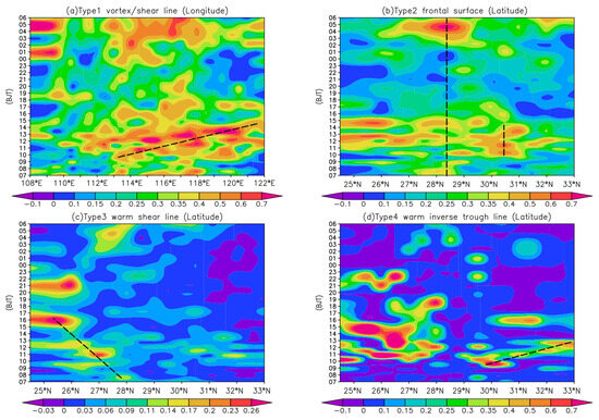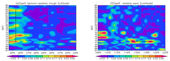 Time–longitude propagation and distribution characteristics of normalized heavy precipitation of the 6 synoptic circulation patterns (normalized by dividing the hourly precipitation ≥20 mm/h by the total 24 h precipitation of the day). (a–f) figures represents six weather circulation patterns, as shown in Figure 2. The dashed lines represents the propagation direction of normalized heavy precipitation.