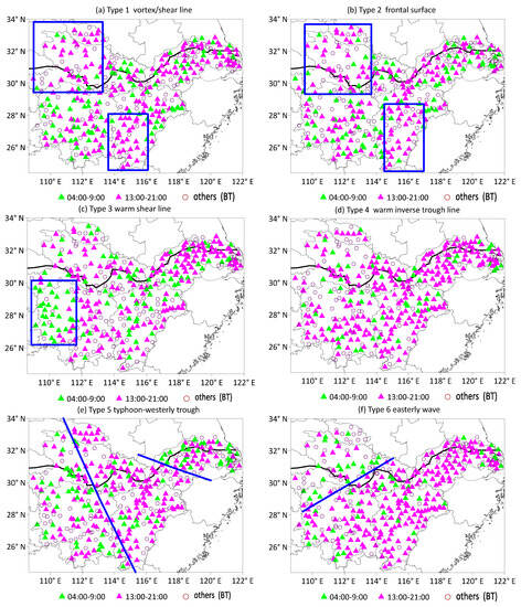 Time phase distribution of peak precipitation in two heavy precipitation periods in 04:00–09:00 BT, 13:00–21:00 BT, and others under the six synoptic circulation patterns. (a–f) figures represents six weather circulation patterns, as shown in Figure 2. (The box line and the straight line are the prominent areas of peak precipitation in the morning or afternoon, or the boundary between the two).