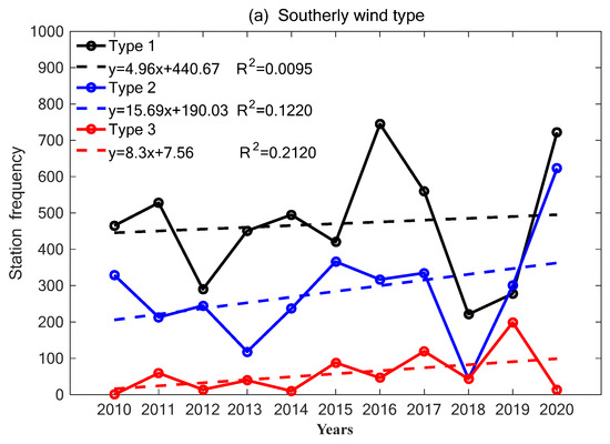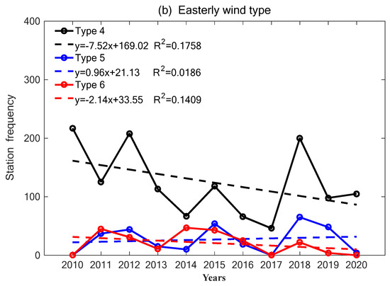 Statistics of the linear trends of the stations with a daily precipitation exceeding 50 mm under each synoptic type over the MLRYR basin show that the number of rainstorm stations for Type 2 (frontal surface) or Type 3 (warm shear line) dominated by the prevailing southwest monsoon (Figure 11a) presents an increasing trend in the past 10 years, while that for Type 1 (vortex/shear line) shows a slight increasing trend, which is somehow related to the recovered East Asian summer monsoon [50]. The number of rainstorm stations for the easterly flow (Figure 11b) for Type 4 (warm inverse trough line) or Type 6 (easterly wave) shows a decreasing trend, especially that for Type 4, which shows a significant decreasing trend, while that for Type 5 (typhoon-westerly trough) shows a slight increasing trend, which may be related to the increased typhoons over the northwest Pacific [51,52,53].