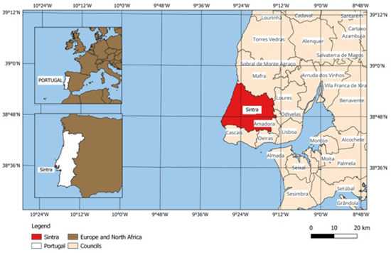 The metropolitan area of Lisbon comprises 18 municipalities, grouped into two sub-regions: the Grande Lisboa and the Setúbal Peninsula. The council of Sintra, whose location is shown in Figure 1, has 319.23 km2 and 385,954 inhabitants [32] and is subdivided into 11 parishes. It is the second most populous county in Portugal and presents great heterogeneity in its territory, with the coastal and northern parishes having forest and rural characteristics, while in the south there are the urbanized parishes, the object of this study. It has a temperate climate with rainy winter, dry summer and low heat (Csb), according to the Köppen–Geiger classification, with an average altitude of 206 m and an annual average temperature of approximately 15 °C [33]. (Figure 1).