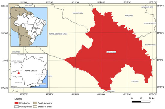The city of Uberlândia, Brazil, is located in the interior of the state of Minas Gerais, 18°55′08″ S, 48°16′37″ O (Figure 2), with an estimated population of 706,597 inhabitants [34], and it has a total area of 4,115.206 km2. It is a major regional industrial and logistical center and its economy is based on industrial and service activities. The climate is tropical with a dry season (Aw) in the Köppen–Geiger classification, an average annual temperature of 22.3 °C, an altitude of 863 m and an IDH of 0.789 [34].