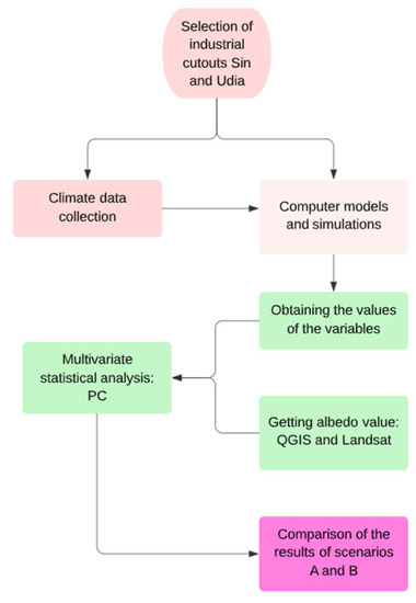 This study is a useful tool to identify the most important variables for the industrial microclimate of two different cities. In future research, we intend to carry out measurements in situ to verify if the conclusions obtained through the simulations are confirmed and to expand the study to other types of LCZs. Since the albedo of the Sintra roofs and sidewalks was responsible for raising the albedo of the cutout as a whole, it is proposed to increase the albedo of Udia roofs by applying acrylic paint with high reflectivity and installing sidewalks with higher albedo. Such changes are expected to have a positive impact on decreasing the AT in the Udia UI, as in the Sintra UI, although it lacks demonstration.