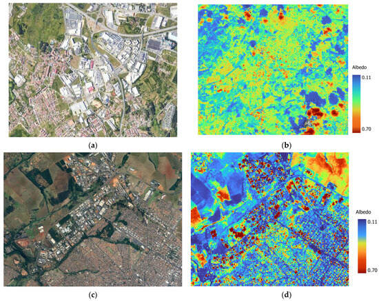 Sintra and Udia UIs and albedo: (a) UI Sintra; (b) Landsat 8 image of Sintra; (c) UI Udia; (d) Landsat 8 image of Udia.