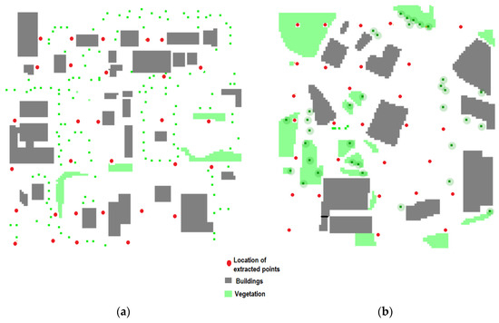 After the simulations, 30 random points were extracted from each studied clipping, for the time of 2 p.m., at a height of 9 m from the ground (Figure 7). These points were identified according to the initials of the city and the location of the point, with U1 referring to point 1 of Udia and S1 referring to point 1 of Sintra, for example.
