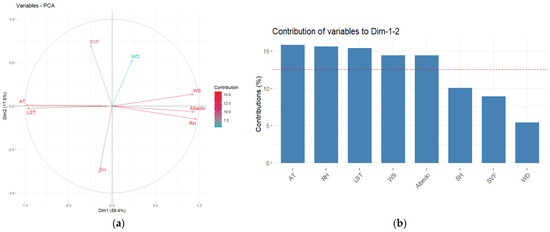The research dataset initially contained eight variables: AT, RH, SH, SVF, WS, WD, albedo, LST. To simplify the descriptions for further analysis, principal component analysis (PCA) was implemented to reduce the dimensionality of the data. The variables that have the highest contribution are highlighted in the bar chart (Figure 9). The dashed line presented in the graph corresponds to the expected average percentage of the variance explained, 12.5%.