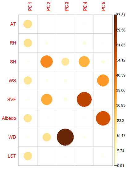 According to Equation (2) and Table 3, in PC1, the variables AT, RH, WS, albedo and LST stand out, and the contrast between AT and RH is evident, which can be called a contrast component between air temperature and relative humidity. In Equation (3), the SH, SVF and WD stand out, since the variation explained in PC1 is independent of the variation explained in PC2.