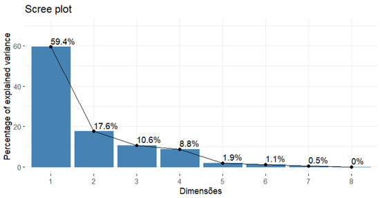 For the choice of principal components (PCs) to be retained, one can resort to the screen plot, where one searches the graph that represents the eigenvalue versus the percentage of variance explained, the “jumping off point” from which the PCs do not have so much importance for the total variance [46]; the Kaiser criterion [51], which selects the PCs according to the value of their eigenvalues, with eigenvalues > 1 belonging to the PCs that explain the greatest variation in the total sample space [43]; or the analysis of representativeness in relation to the total variance, in which the researcher predetermines a percentage of explanation of the total variance, according to the phenomenon studied, with commonly accepted values being above 70%.