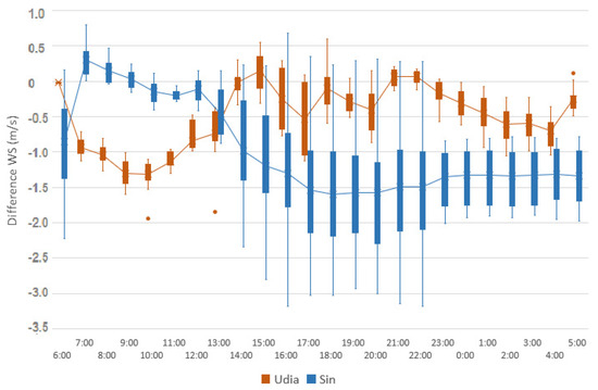 Comparing the difference between the WS at the UIs and the control points, negative values are identified for UI Sin and UI Udia, reaching up to −1.9 m/s and −1.2 m/s, respectively; that is, the WS in the control points is greater than that recorded in the UIs. The less pronounced difference for the UI Udia may be a consequence of the lower percentage of the built area (−40%) compared to the UI Sintra, since the higher built density provides physical obstacles to the passage of the wind, reducing its speed [2].