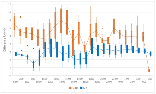 As a comparative parameter, control points were adopted in each city, which are located in regions with low vegetation and no buildings, are fully exposed to solar radiation and lose moisture more easily, and do not benefit from the shading effect. Comparing the RH and SH between the UIs and control points, it was found that both the RH and the SH of the UI Udia were higher than those found at the control points, with peaks of 8% and 3 g/kg, respectively, contrary to UI Sin, whose difference remained close to zero.