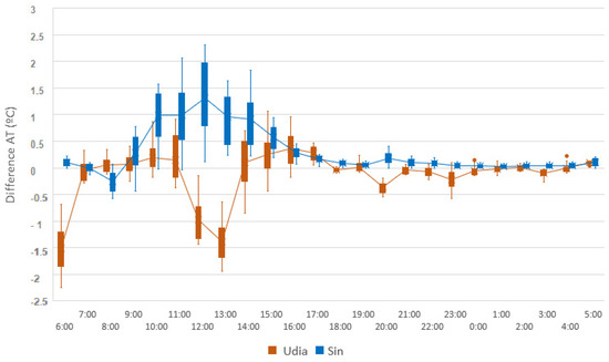 Figure 17 shows the difference in AT of Udia and Sintra and the control points: after sunset, around 19 h, the two clippings show a decrease in the AT difference, remaining approximately constant. For the Sintra UI, the difference between the temperature of the control point and the temperature inside the UI remained positive during almost the entire period, reaching its peak at 12 h, with a difference of 1.2 °C. The Udia clipping, on the other hand, showed an inverse behavior; during the period of radiation incidence, the points inside the UI showed lower air temperatures than the control points, reaching a maximum difference of −1.5 °C at 13 h.