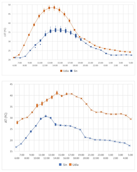 When comparing the LST in the industrial cuts, shown in Figure 18, it is noted that the peak of LST in Sin UI is 25.5% lower than that registered in Udia UI, and the peak hours coincide with the maximum AT regardless of location.