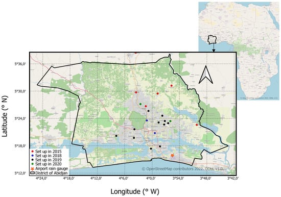 The study area is the district of Abidjan with an area of 2119 km2. Its urbanized section was equipped with a network of rain gauges (Figure 1). It is located on the coast of the Gulf of Guinea between latitudes 5.23° N and 5.60° N and longitudes −4.46° W and −3.71° W. Its tropical climate is hot and humid with four seasons regulated by the West African monsoon. In a recent article, the Direction de la Météorologie Nationale (National Weather Service) indicated the following seasons: the long dry season from December to March, the long rainy season from April to July, the short dry season from August to September, and the short rainy season from October to November [26].