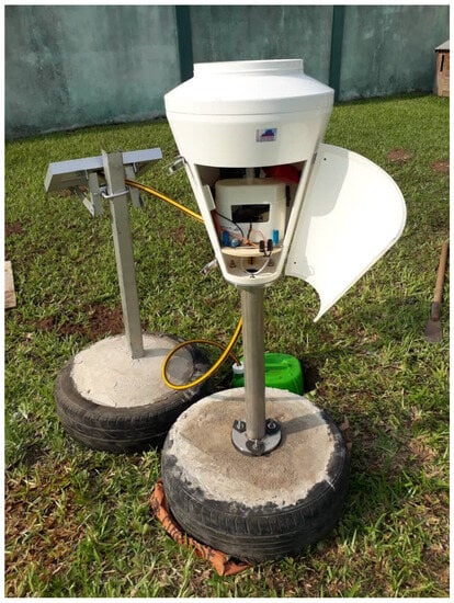 Through this study, we analyzed rainfall data from a research network of 21 rain gauges installed between 2015 and 2020, as can be seen in Figure 1 and in Table 1 [27]. The network is mainly deployed in the urbanized part of the district (representing roughly a box of 30 km × 40 km) with an average distance between rain gauges of 14.2 km. The minimum and maximum distances between rain gauges are 1.2 km and 39.6 km, respectively. Half of the rain gauges in the network have an inter-distance of less than 5 km. This relatively high density makes the network unique in an urban environment, particularly in sub-Saharan Africa. Rainfall is recorded with the same model of Precis Mécanique® tipping bucket rain gauges calibrated at 0.5 mm (Figure 2). The interception cone located at 1.5 m from the ground has a surface of 400 cm2. The rain that has passed through the rain gauge is collected in a totalizing can at the foot of the apparatus. The tipping dates of the buckets (day, month, year, hour, minute, and second) are recorded in a HOBO Pendant® data logger and then collected and reviewed monthly. After a critique and comparison with the totalizer, the tipping dates are aggregated in regular 5-min time steps. When a rain gauge malfunctions, its data are put into gaps over the identified period, and the values are replaced by NAN (not a number). In practice, the data we used in the present study are spread over four years from 7 January 2018 to 31 December 2021 to consider year from which we start densification of the network. In addition, before 2018, the network operation was not optimal, with many gaps at some stations. The data are available in the ORIESA database and identified with the DOI: https://doi.org/10.23708/JOE1X6? Thirteen (13) of these rain gauges are equipped with a remote transmission system. The data are processed and displayed on a map of the city, showing rainfall totals over the last 5 min up to the previous 3 days. The maps can be viewed in real time at http://www.babipluie.org/ (accessed on 20 February 2023) and are updated every 5 min.