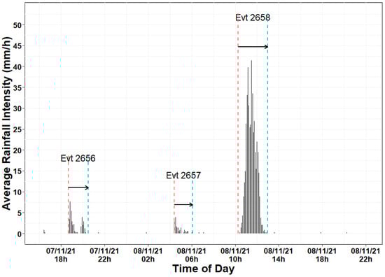This study used the drawre function of the IETD library [31] of the R software version 3.6.2 [32], which allows for the identification of the beginning, end, duration, average intensity, and rainfall amount of the different rainfall events from the average hyetograph. Based on this information, the event rainfall amount at each rain gauge was computed. In a final step, we identified the events that lasted at least 30 min with a minimum rainfall amount of 1 mm observed in at least one rain gauge of the network. This approach ensures that only significant rainfall events are considered for further analysis.