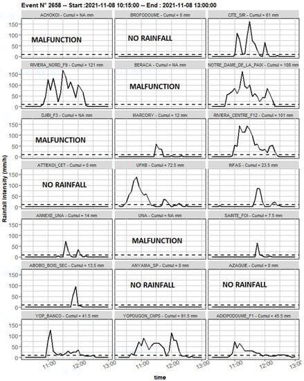 Figure 4 below shows event #2658 of Figure 3 above as measured by the rain gauge network. This event was not measured by all the rain gauges as some stations were dysfunctional and some data were missing. The maximum intensity (in 5 min) of this event exceeded 150 mm/h, but this peak of rain rate varied significantly over the network. At the individual rain gauge level, it was obvious that the time of the effective start of the rain, as well as the duration of the rain, was highly variable from one rain gauge to another. However, when working at the network scale, the start time and duration were standardized. The ground signature for the same event can be different depending on the position of the rain gauge in the network. For example, at the rain gauge RIVIERA_NORD_F9, all the intensities exceeded 10 mm/h with several peaks of convective intensities, but at the rain gauge MARCORY, there was only one convective peak.