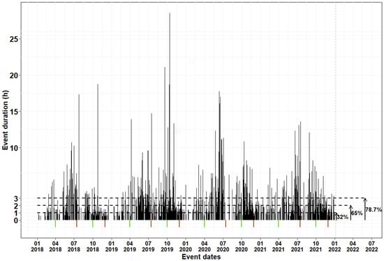 Figure 5 below shows the distribution of the event duration as a function of time. This distribution is related to the rainy seasons, during which the longest rainfall events were observed. From the total event number, events lasting up to 1 h represented 32%, events lasting between 1 h and 2 h represented 33%, and events lasting at least 3 h represented 21.3%. The longest event lasted 1 day 4 h 35 min. The average duration of rainfall events was greater in June (3 h 00 min), followed by July (2 h 50 min), reaching a lower value in January (1 h 17 min) and December (1 h 28) min. Over the study period, the average duration was 2 h 16 min.