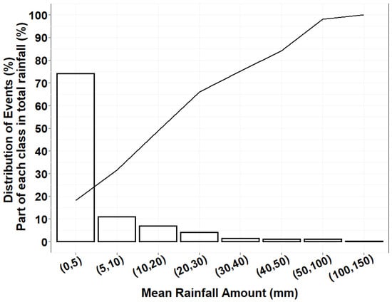 The distribution of the average cumulative rainfall (bar) and the cumulative contribution to the annual rainfall of each class of event average rainfall (line).