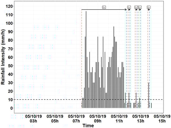 An example of the convective/stratiform classification of intensities and identification of convective episodes for the event of 5 October, 2019 at the Adiopodoumé rain gauge. Horizontal dashes represent the 10 mm/h threshold used for classification. Vertical dashes limit the beginning (red) and end (green) of convective episodes marked by «Cv».