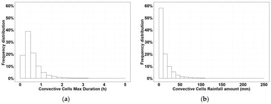 - The duration of the longest convective episode identified with a longer lifetime. This value was determined for each rainfall event and each rain gauge.
