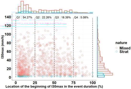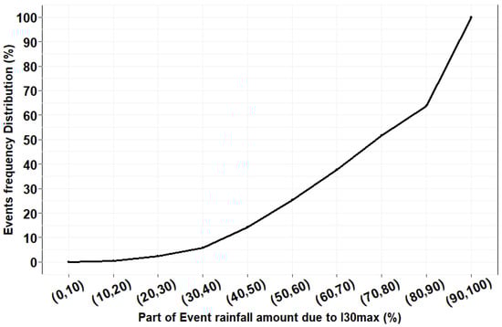 The average maximum rain intensity in 30 min (I30max, cf. Figure 9) was related to its time of occurrence, relative to the duration of the event, i.e., as a percentage of the total duration of the rainfall event.