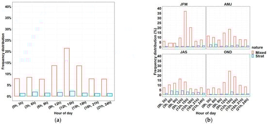 The starting times of the rainfall events were grouped into 3 h periods. The results are presented, as distribution, in Figure 11. This figure shows that a rainfall event could start at any time of the day. However, some time periods appear as preferential moments, following the diurnal cycle of sunshine. Indeed, the highest occurrence (~24%) was observed between 12 pm and 3 pm, and more than half of the events (54%) started between 9 am and 6 pm. The different times during the night showed similar occurrences. There was no preferred time for the start of the stratiform rainfall.