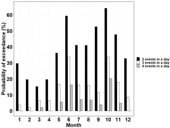The probability of occurrence of x or more rainfall events during a single day was defined, based on the date of the beginning of the rainfall events. For each month of the year, we evaluated the number of days with the start of at least two, three, or four rainfall events. This number was then divided by the total number of events for each month, and the resulting probability was analyzed according to the months of the year.